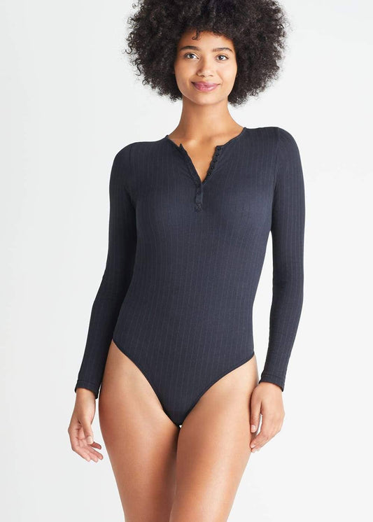 Katrina Henley Long Sleeve Thong Bodysuit - Cotton Rib