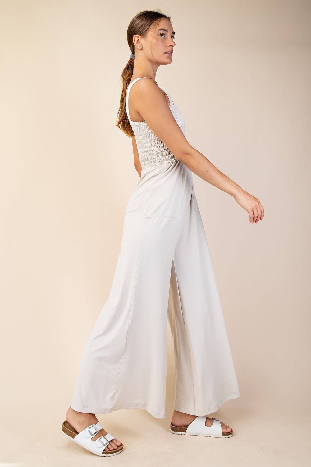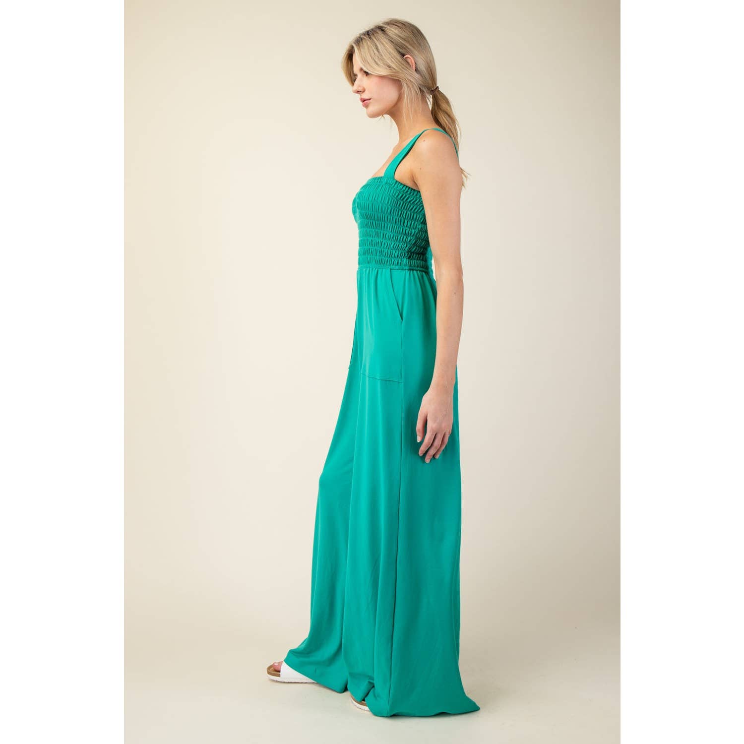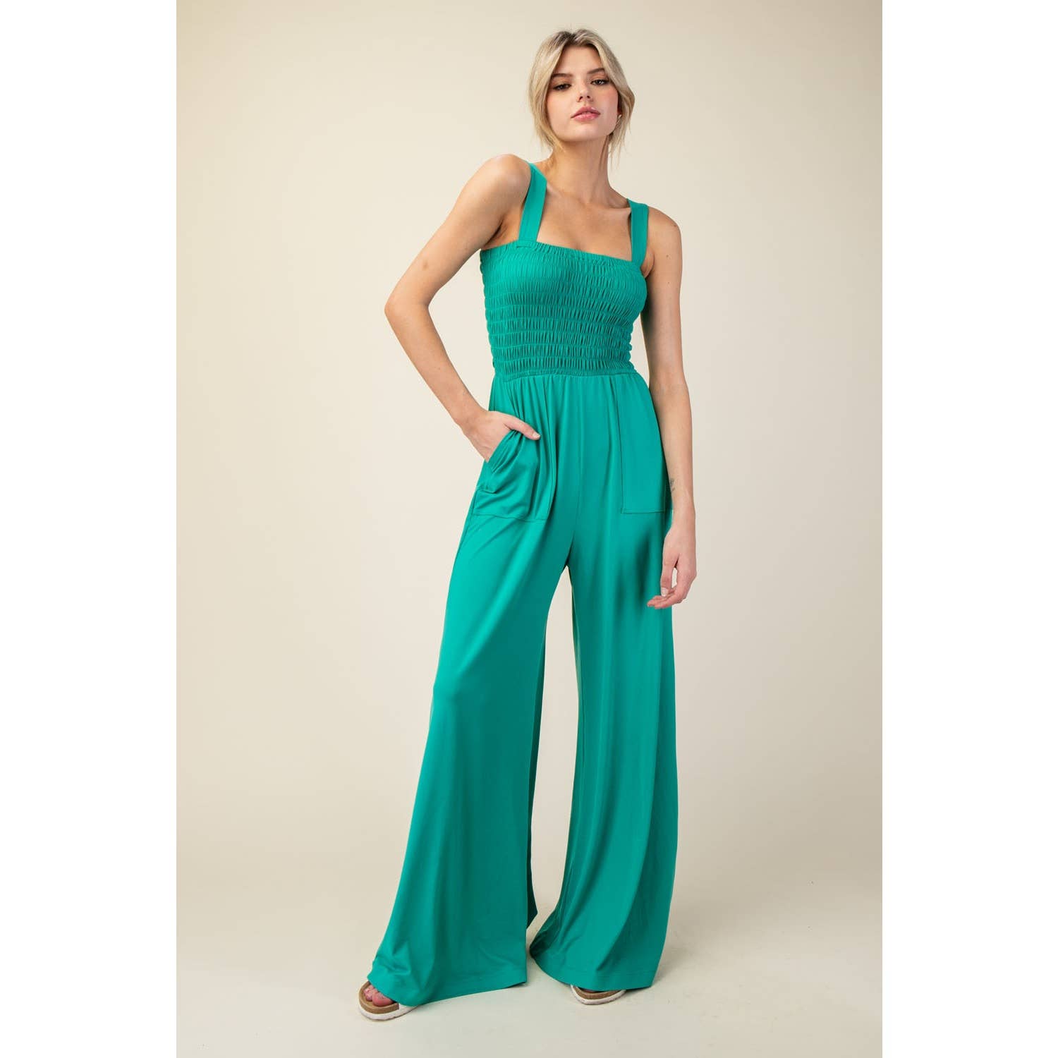 Get ready to feel buttery soft in our premium Smocking Jumpsuit! Featuring wide pants, a sleeveless design, and convenient pockets, this jumpsuit will elevate your style while keeping you comfortable all day long. Made with 84% Poly Microfiber and 16% Spandex, it's the perfect blend of luxury and stretch. Our model is 5'9" and is wearing size Small. Imported with love and care.