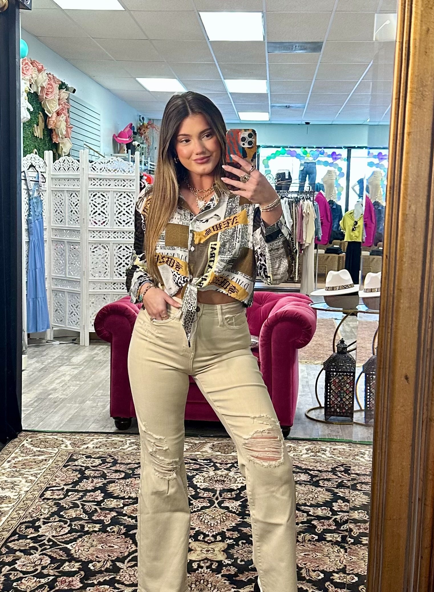 The Loud News Top features a distinctive newspaper and animal print design, complemented by a long sleeve collared button-up style. The bottom tie detail enhances the silhouette, providing a unique fashion statement suitable for various occasions. Its blend of patterns and structured form offers versatility in styling.