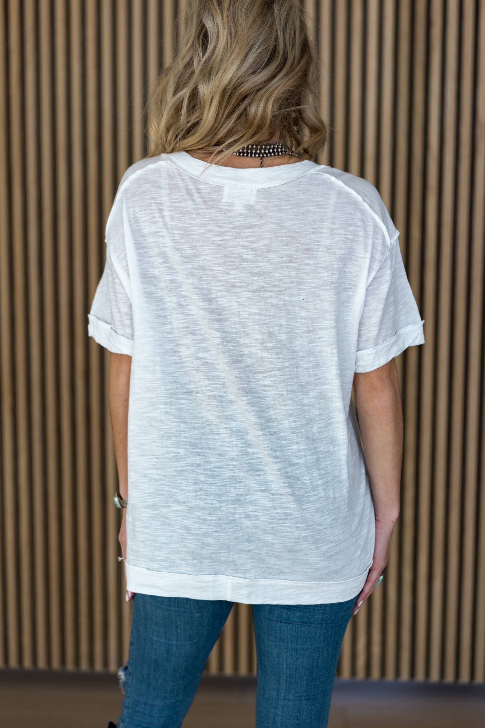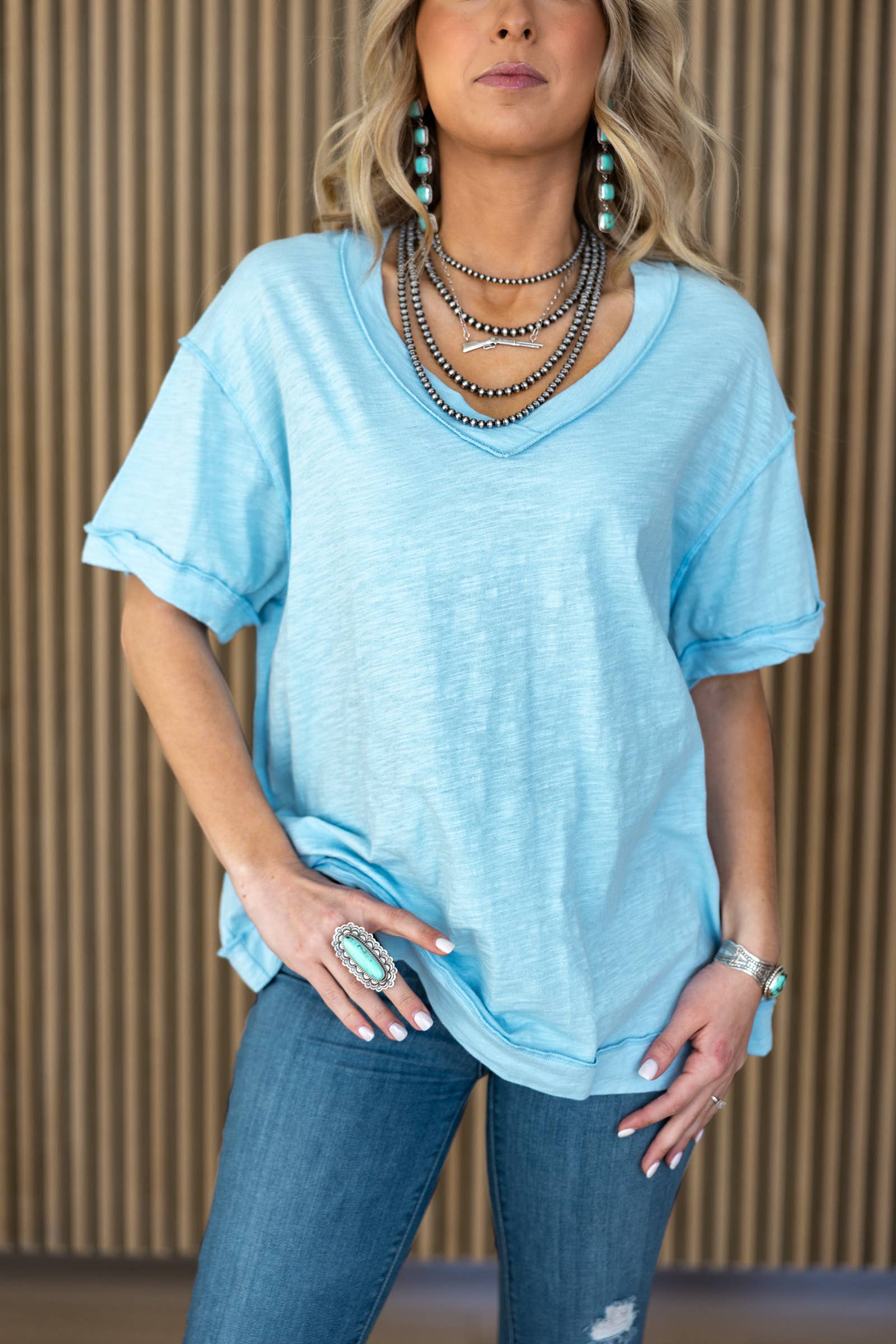 Add a touch of relaxed style to your wardrobe with this v neckline cotton top. Featuring short sleeves and unique raw edge details, this top combines comfort with a modern, edgy look! Perfect for casual days! Knit, stretchy.