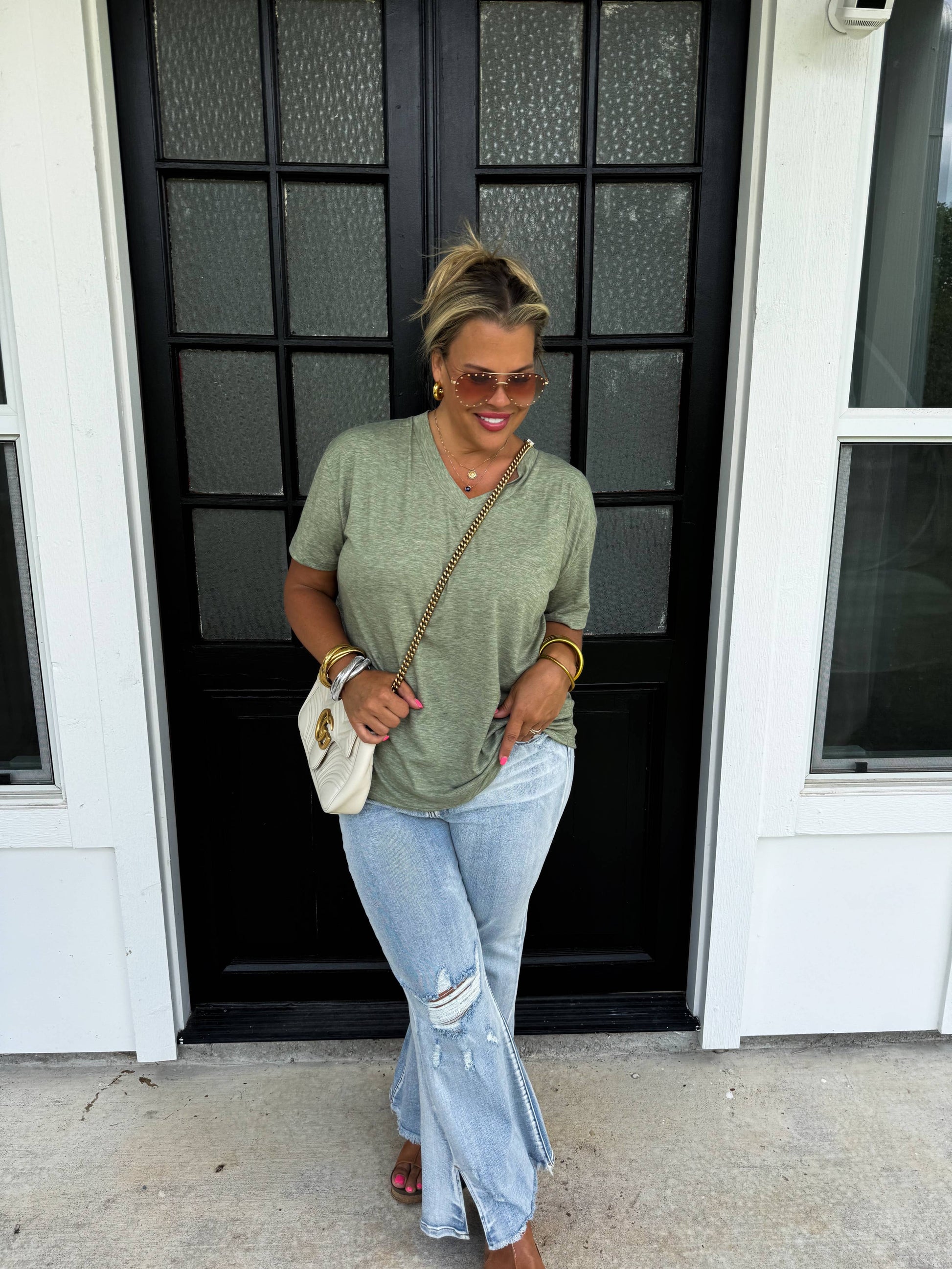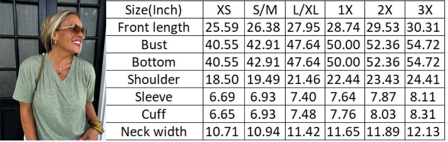 The perfect basic boyfriend tee that everyone needs! Pair with cardigans or wear with jeans or leggings! Amazingly soft jersey slub fabric! Fit: Loose and slouchy with a deep V neck. MODEL: BLAKELEY- 5’6 size 14/16 wearing 1X BIANKA- 5'6 size 4/6 wearing S/M MSRP $30 MADE OVERSEAS FABRIC: 35% COTTON 60% POLY 5% SPAN XS- 0-4 S/M: 6-8 L/XL: 8-14 1X: 16/18 2x: 18/20 3x: 20/24